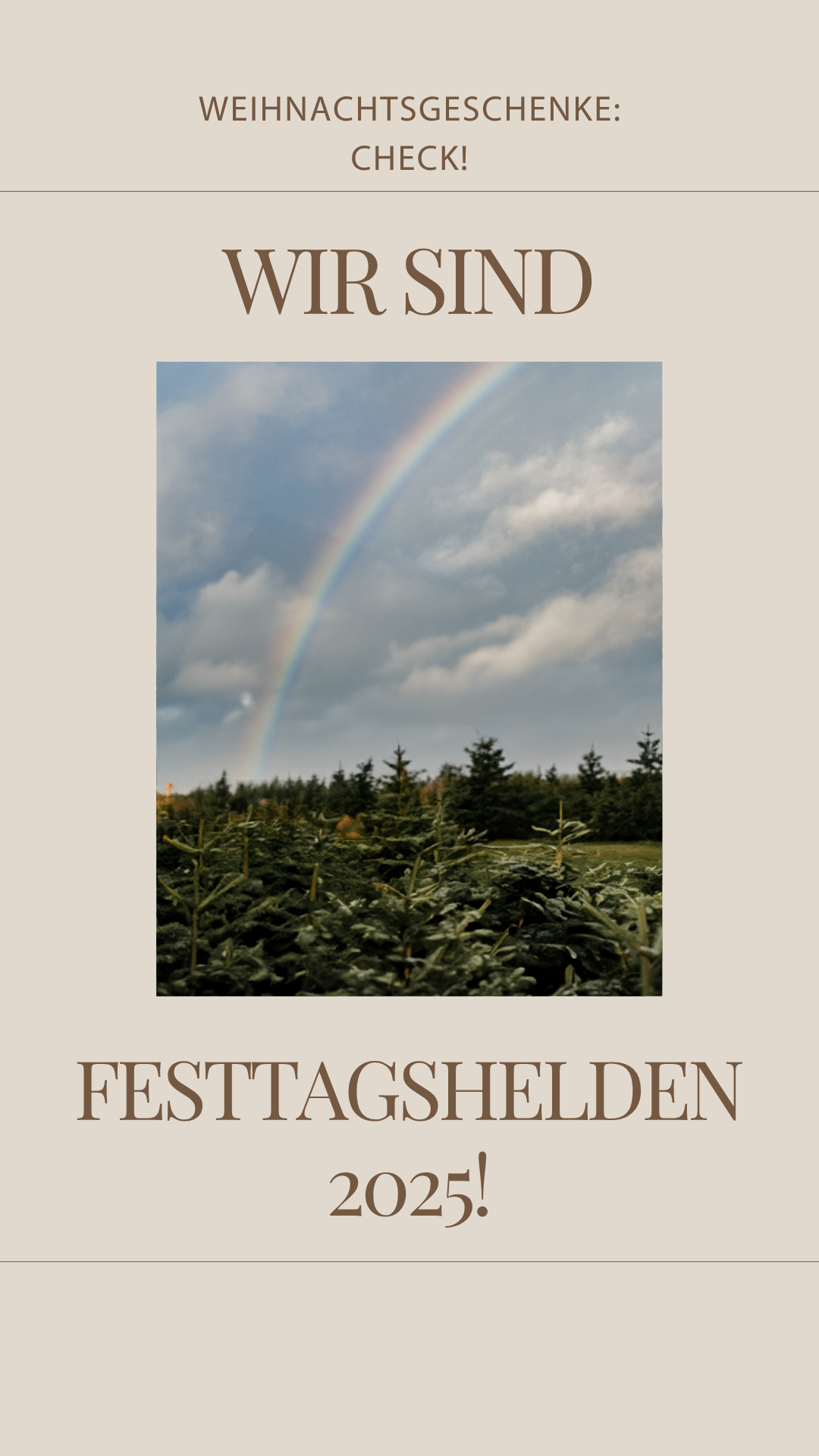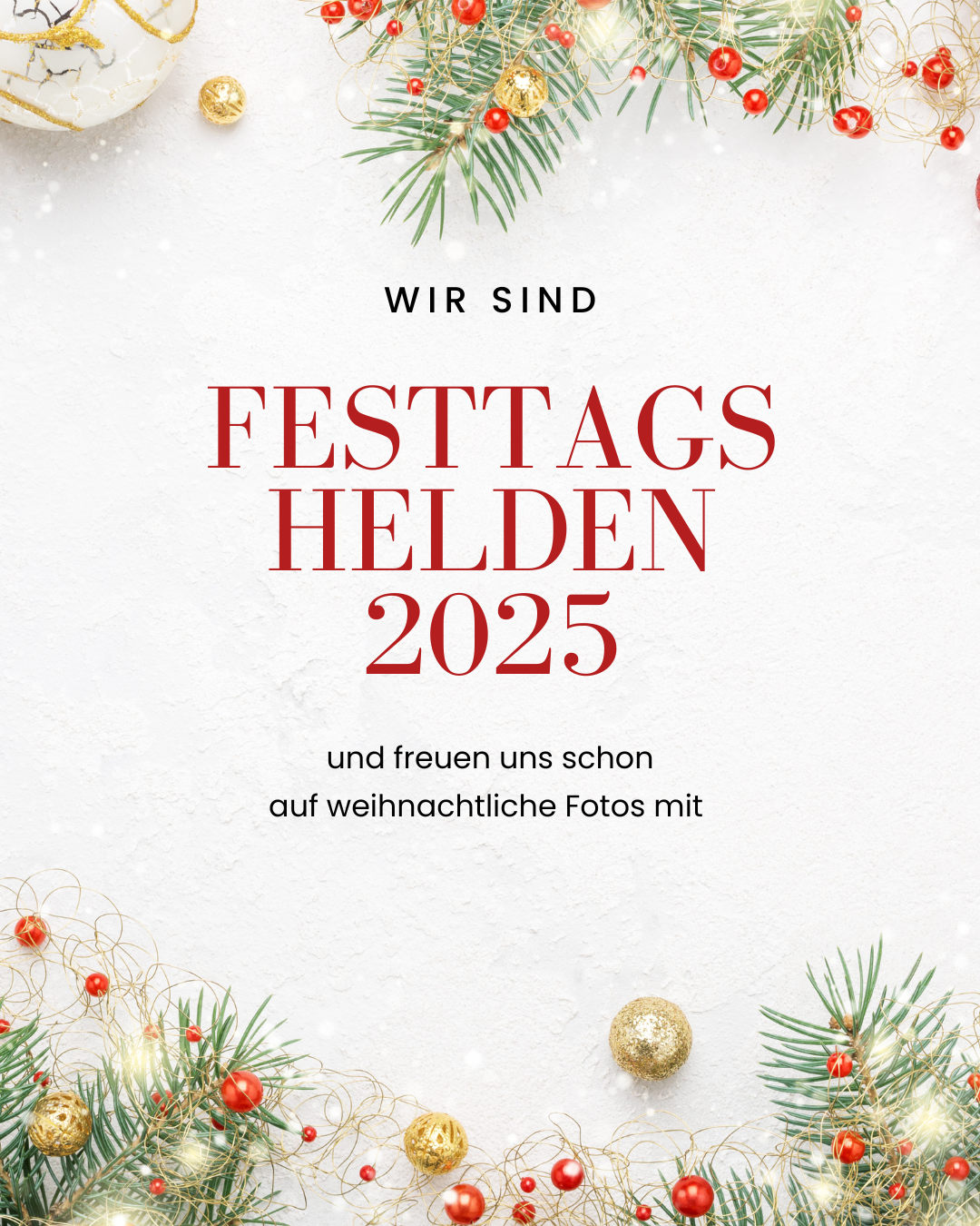 Für viele Familien und Paare sind die Festtagshelden schon eine kleine Tradition. Wir als kleines Familienunternehmen würden uns sehr freuen, wenn du die Aktion auf Social Media teilen würdest. Wir haben dir dafür sogar schon zwei Vorlagen erstellt, die du nur herunterladen uns nur markieren kannst. Egal ob als Post, Reel oder in deiner Story!
